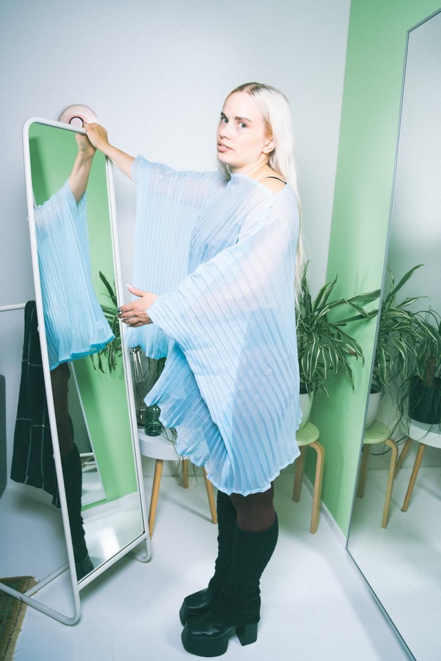 100 % polyesteri – valittu sen rakenteen vuoksi: pliseeraus säilyy muodossaan, eikä vekki katoa kastuessa.